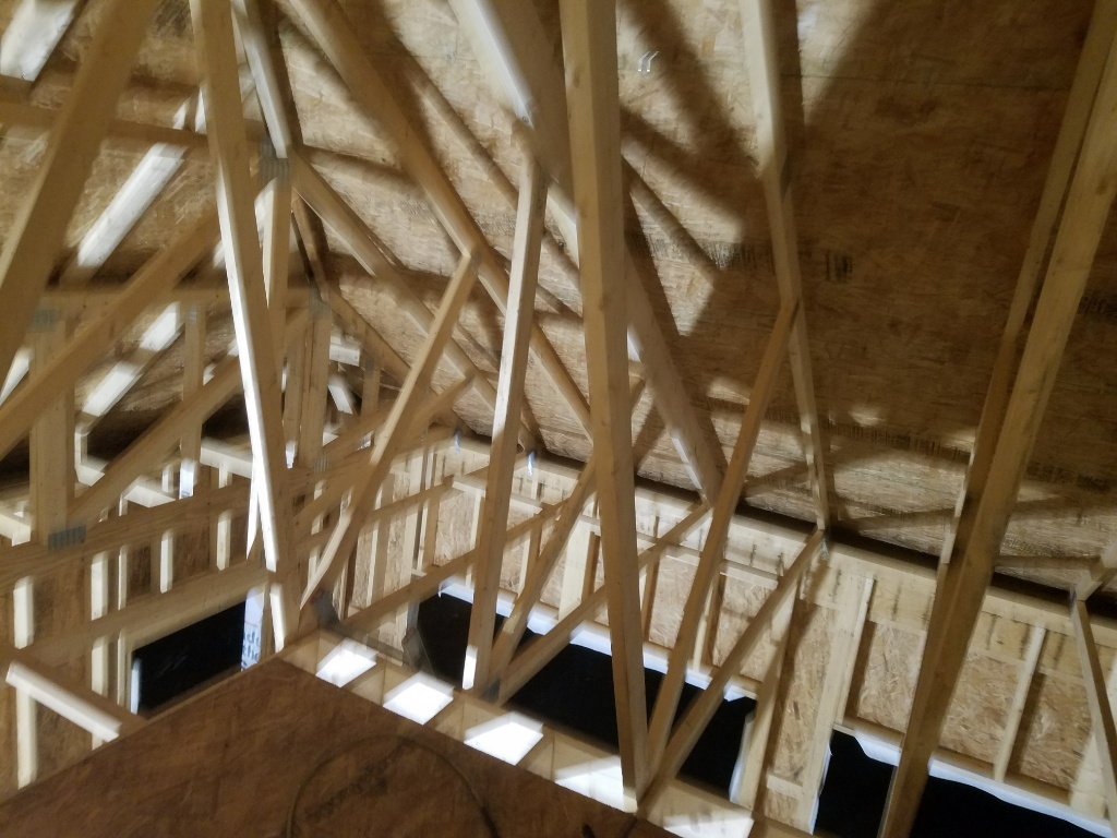 3 trusses complete, #4 at about the 1/2 way point...4 to go. Where I've done the trusses the floor is really solid, noticeably stiffer than the end I haven't done, but I guess that could just be the floor joints touching the sheeting every 12" instead of every 24"...but it feels good and it's staying level so I'm feeling pretty good about it.