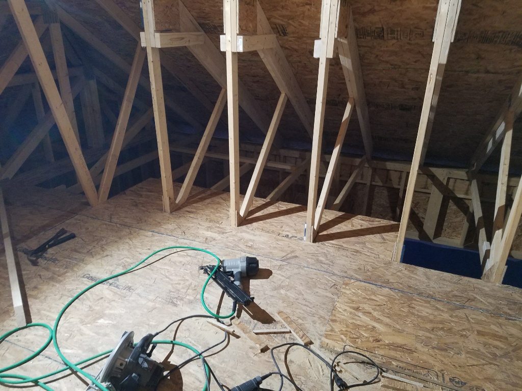 I didn't quite finish but the front wall is getting sheeting to give me 2' deep built-in shelving. The back walk I sheeted everything thinking stuff like stock rack or anything light but bulky, there is also access from the stairs. Lana is noe officially mad at how much I'm spending up stairs so no more changes.