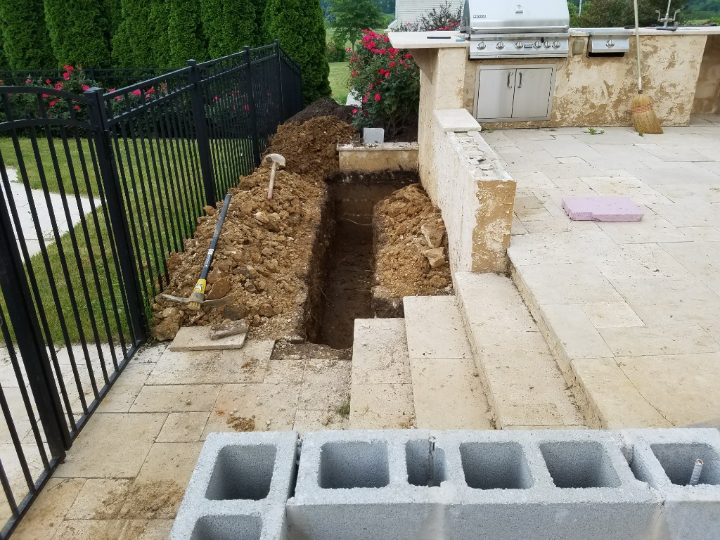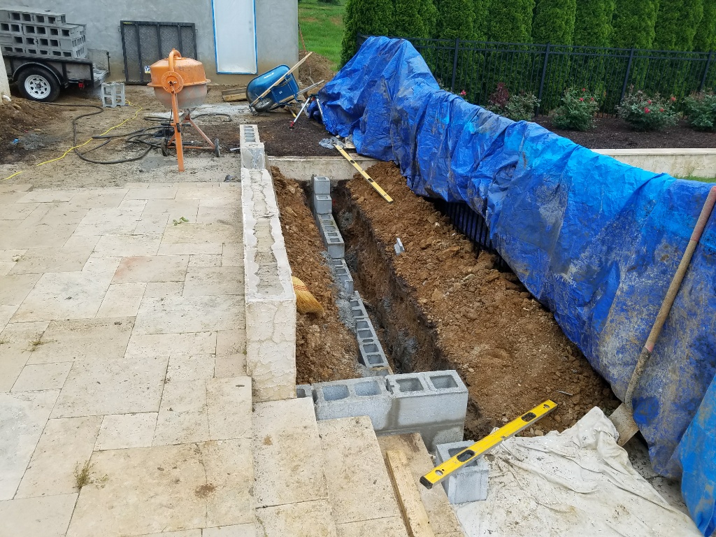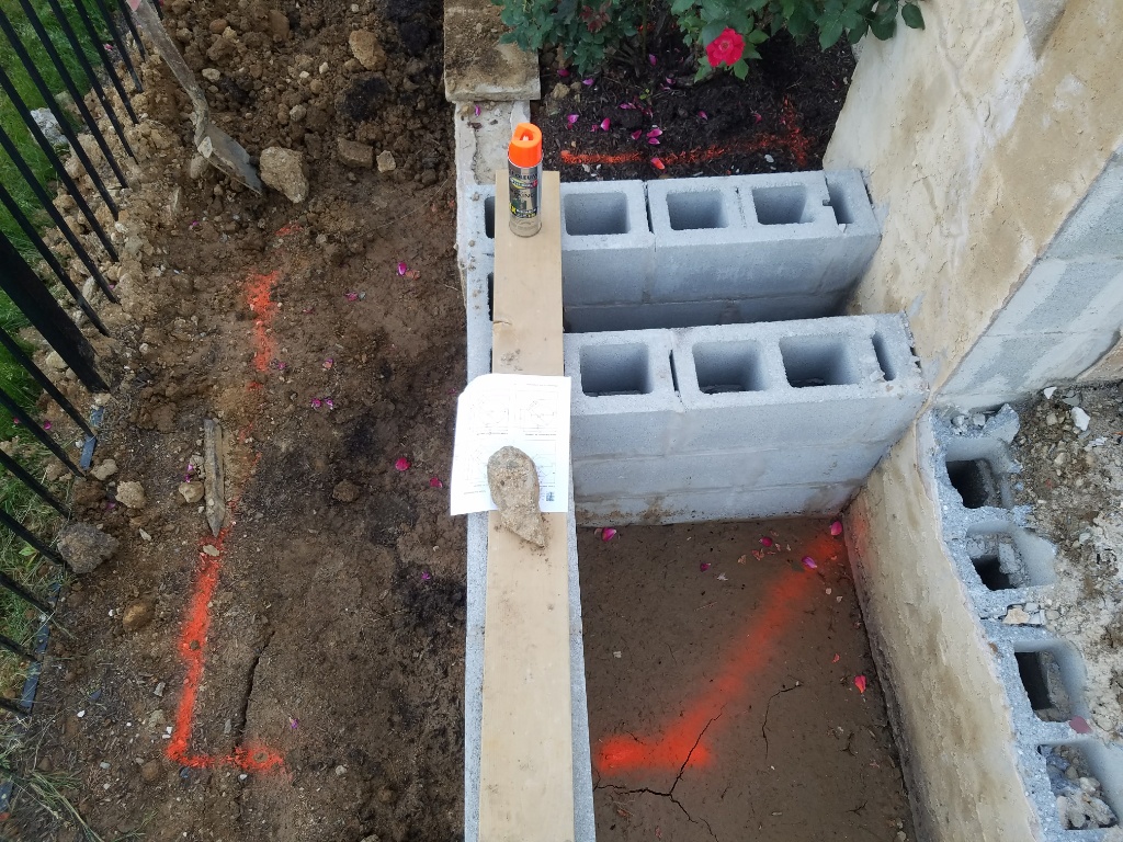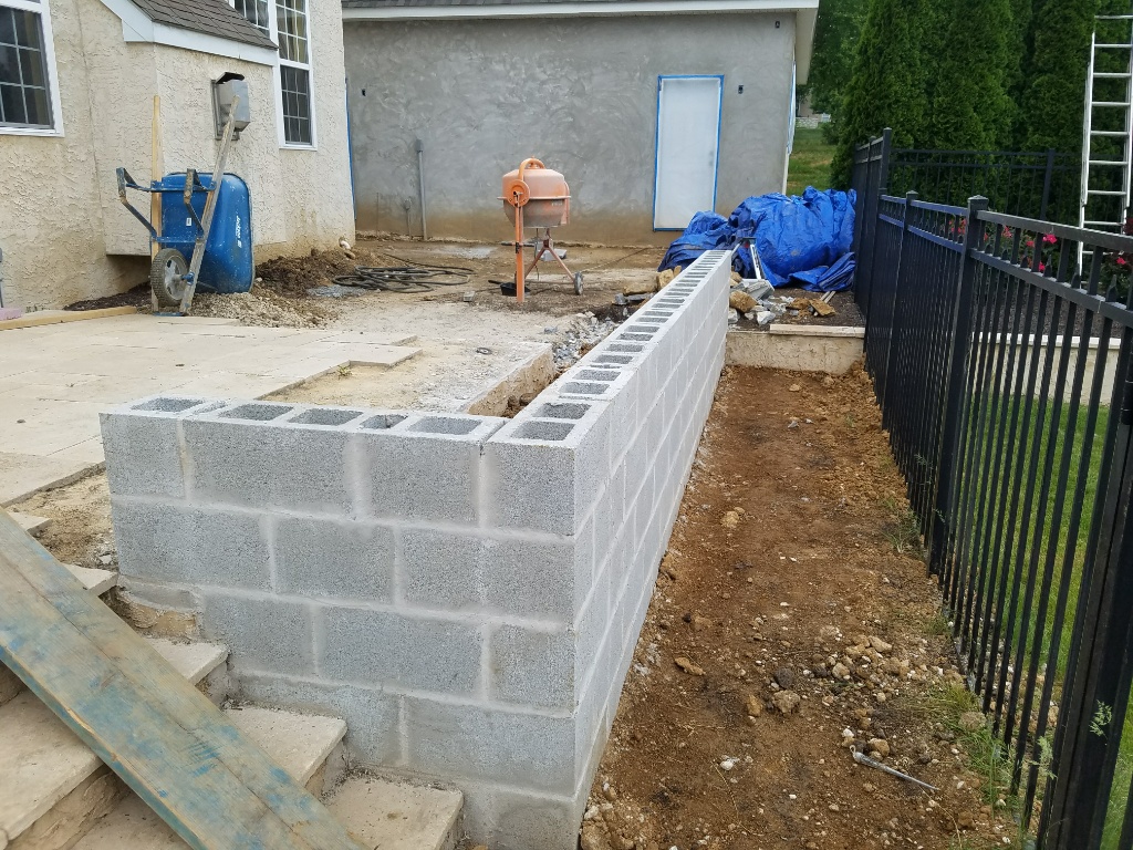 I changed my mind a little over the weekend. I build the 1st side to be a sitting wall but it just didn't look right so I build the 2nd side patio height ...and we settled ( I think) on patio height, so I had to remove 2 courses from wall 1. While I was removing stuff I took the top off the old wall so it won't interfere with getting the heigh of the pavers set then spent Sunday, between rain showers, cleaning up rubble.
