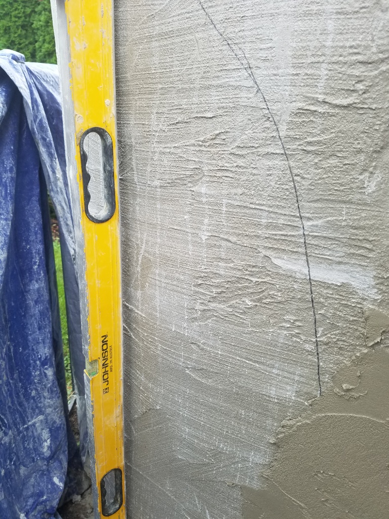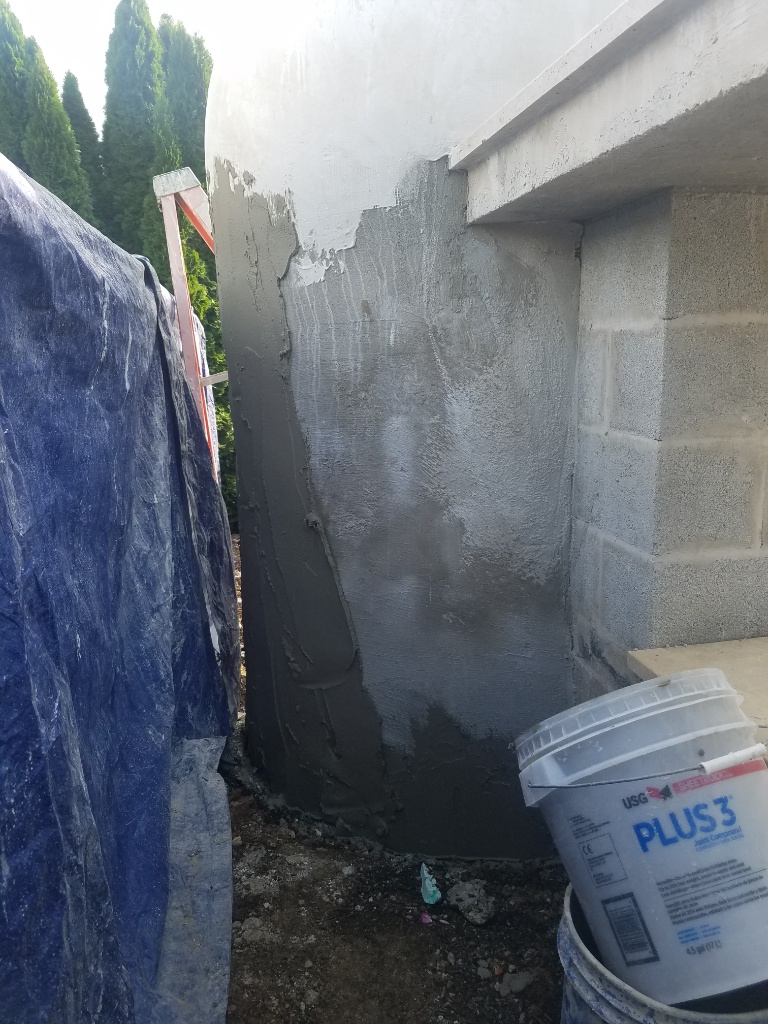 I did 1 coat Friday and beat the rain then Saturday rushed home after soccer to try to get coat 2 done during a break in the rain ....this time i was not so lucky and the rain started just about the time i was towlingvon the last of the mortar and i still had to sponge it smooth so about 15-20 minutes of light rainbefore i could get plastic on.....a little damage but not bad considering.