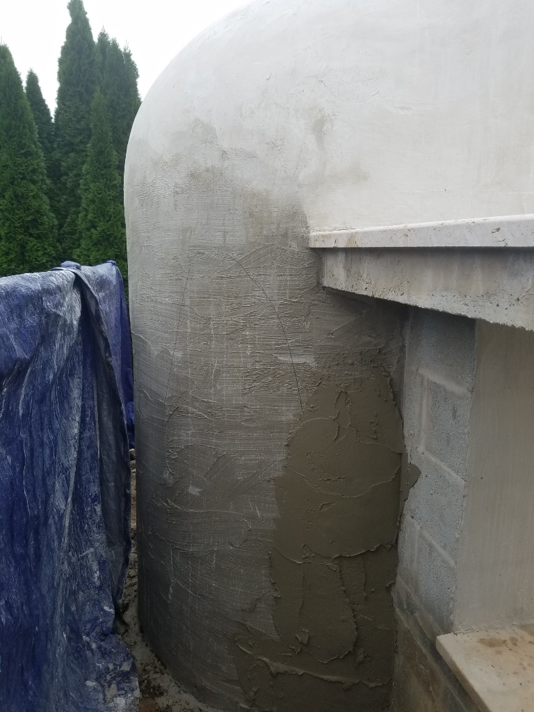 It was dark this morning but not raining so I snapped a couple picks of last Saturday's work. The dome with the insulation came out a little bigger than expected and over hung the base by 1.5-2" per side. That means I need to build up the base with mortar before I can finish stucco anything.....no way to do that in 1 coat. I have 2 coats on and it looks like #3 will get me close enough.