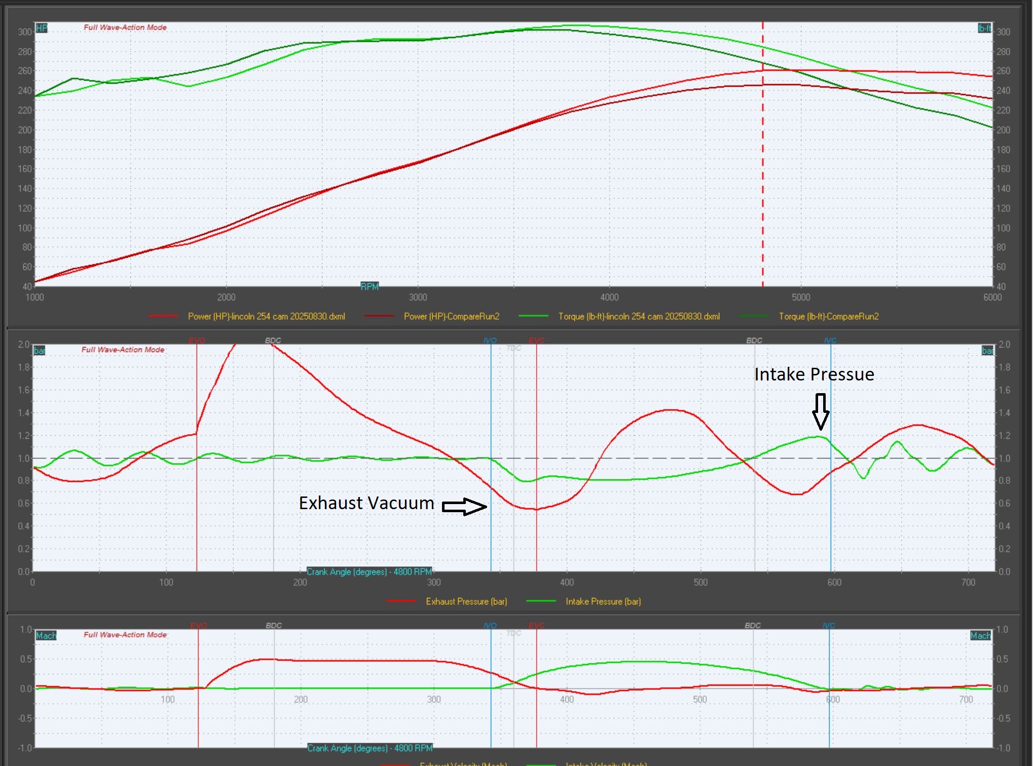 In in the 2nd graph you can see the intake and exhaust wave tuning...the exhaust is tuned to pull about 5pis vacuum during valve cross-over to get the intake charge moving and scavenge the chamber, then the intake is making about 3 psi as the intake valve closes...that is how "tuned" intake and headers add hp. If I change the runer lengths those pulses change..they shift rpm and the number of reflections will change with bigger length changes. The headers are pretty standard 3rd reflection (3 pusles on the graph...shorties you'd expect 4, long tube headers 2 but 3 is usually optimal for hp. In the intake its a vert short runner at 6.5" valve to trumpet....you see the wave completely disappears there are so many reflections. Normally intake want to also be 3 reflection but the port is much too small and the software is saying the flow restriction of a well tuned runner is higher than the gain the tuning delivers so a very short runner the allow recapture of the flow momentum is about the best I can do....so you only see 2-3 psi where something like the frankenferrari the pulse is 10-12 psi....there will be alot of focus on what can be done to improve the intake port.