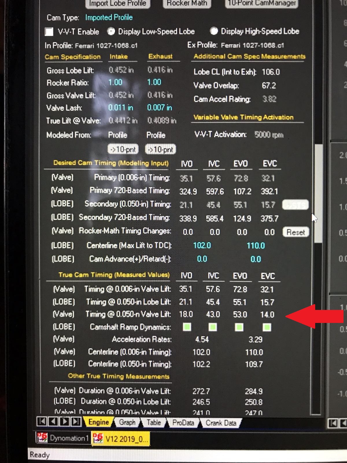 m using the marked row, true timing at .050 lift at the valve which accounts for lash, the line above is at the cam and would be how ferrari says to set timing by first setting the valve to 0 lash. The lobe are a symmetric grind, which means the lobe center, which is what I'm really setting is exactly in the middle so if I set opening and closing is off, I just split the difference and the lobe center will be correct.