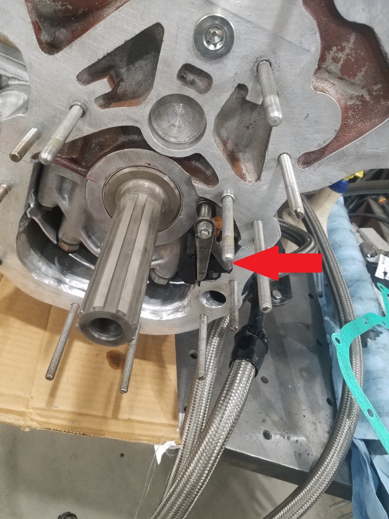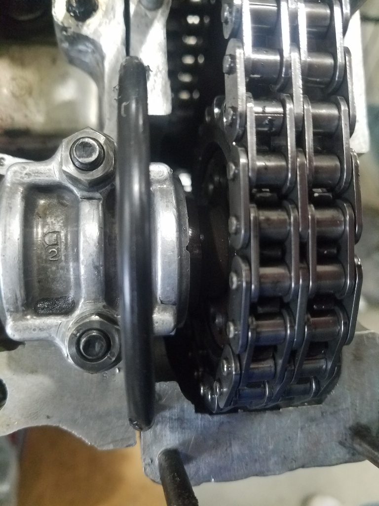 Then the fun really begin. First stage the cover itself with the oil pump and timing chains and the 2 crank gear/sprockets because there is no way to reach any of this once the cover goes on so it has to be in place and you have to try to get the gears on the crank and timing chain drive onto its studs as you go (I drilled hole in the front of the cover to allow access to the timing chain drive nuts so they can be installed last).
