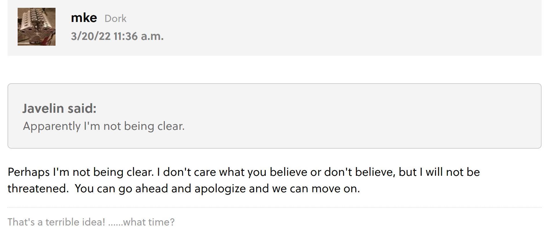 On that note we got our very first banned user today....in case it wasn't obvious there is a no libel policy particularly when it concerns me and it doesn't matter where I see it. No, I'm not now nor have I ever been banned from any forum but you Gammaboy on the other hand can no longer say the same - fuck off and your account's deleted.