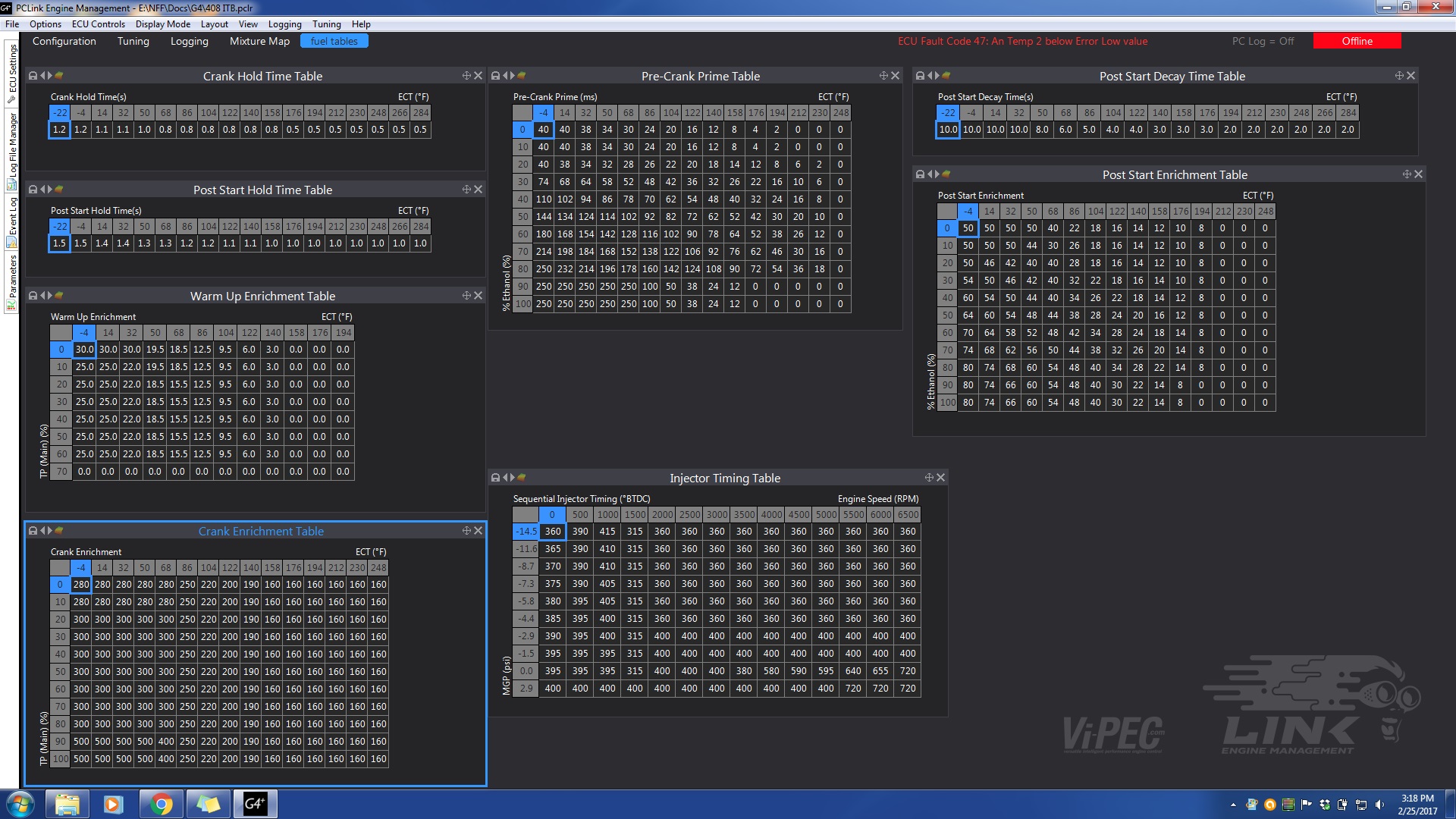 My crank enrich is at 350%....which is not much more than yours and my guess at VE was 50% where is looks like you're at 65-70 so really I have almost exactly the same fuel flow for starting. My tables are a bit different....I currently have a dedicated cranking anything, but do have cranking RPM in the VE and spark and I have a CLT vs cycle count table that primes and enriches during cranking/post start....at least in theory because I haven't turned it on yet. and I can add anything that seems like it might be helpful
