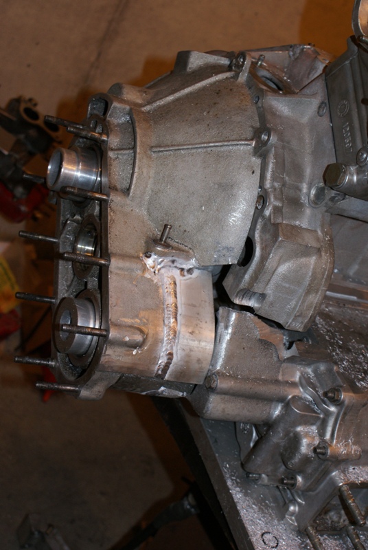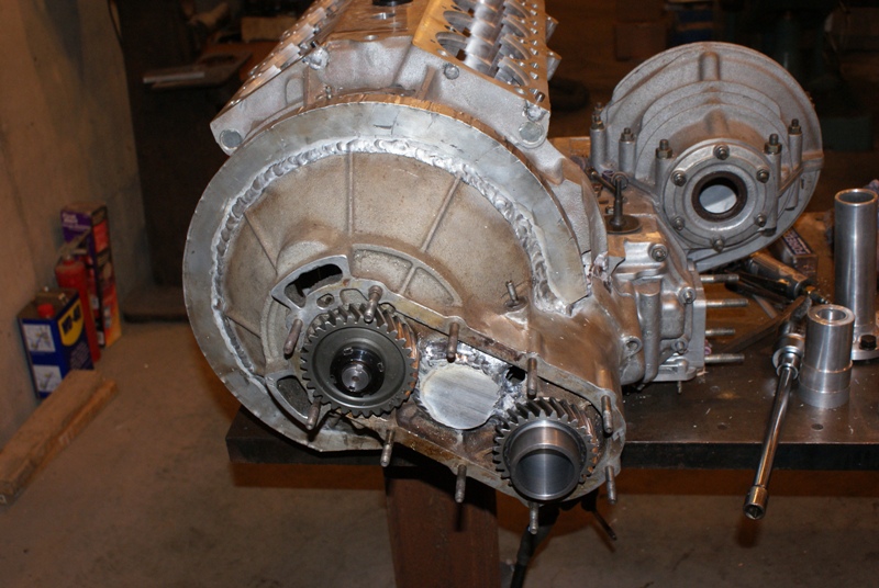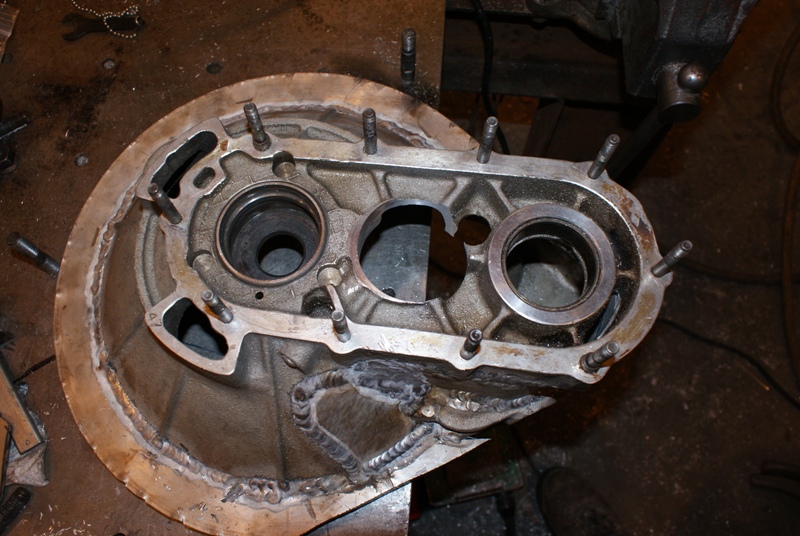 It looks like I left off with a new boss welded in the the bellhousing/drop gear case and the center located but it needs to be machined for the bearing.