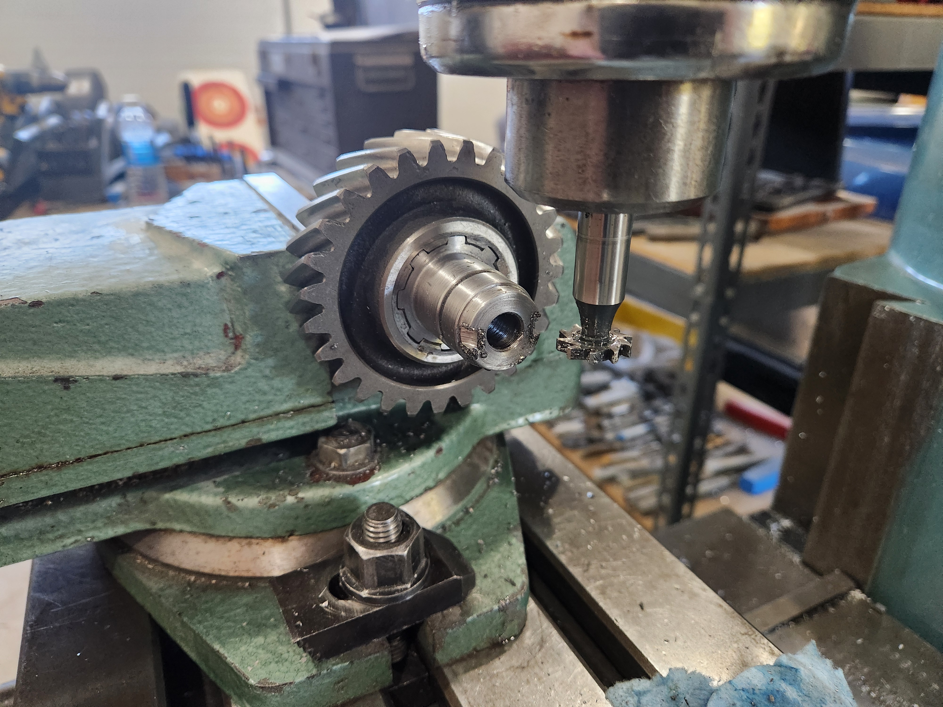 Then broach the splines on the mill. About .002" per pass seemed about right and its mostly done now. The tooth profile is supposed to be a radius so tomorrow I'll grind that into the tool and finish it up, there is a few thou left to cut so it should go quick.
