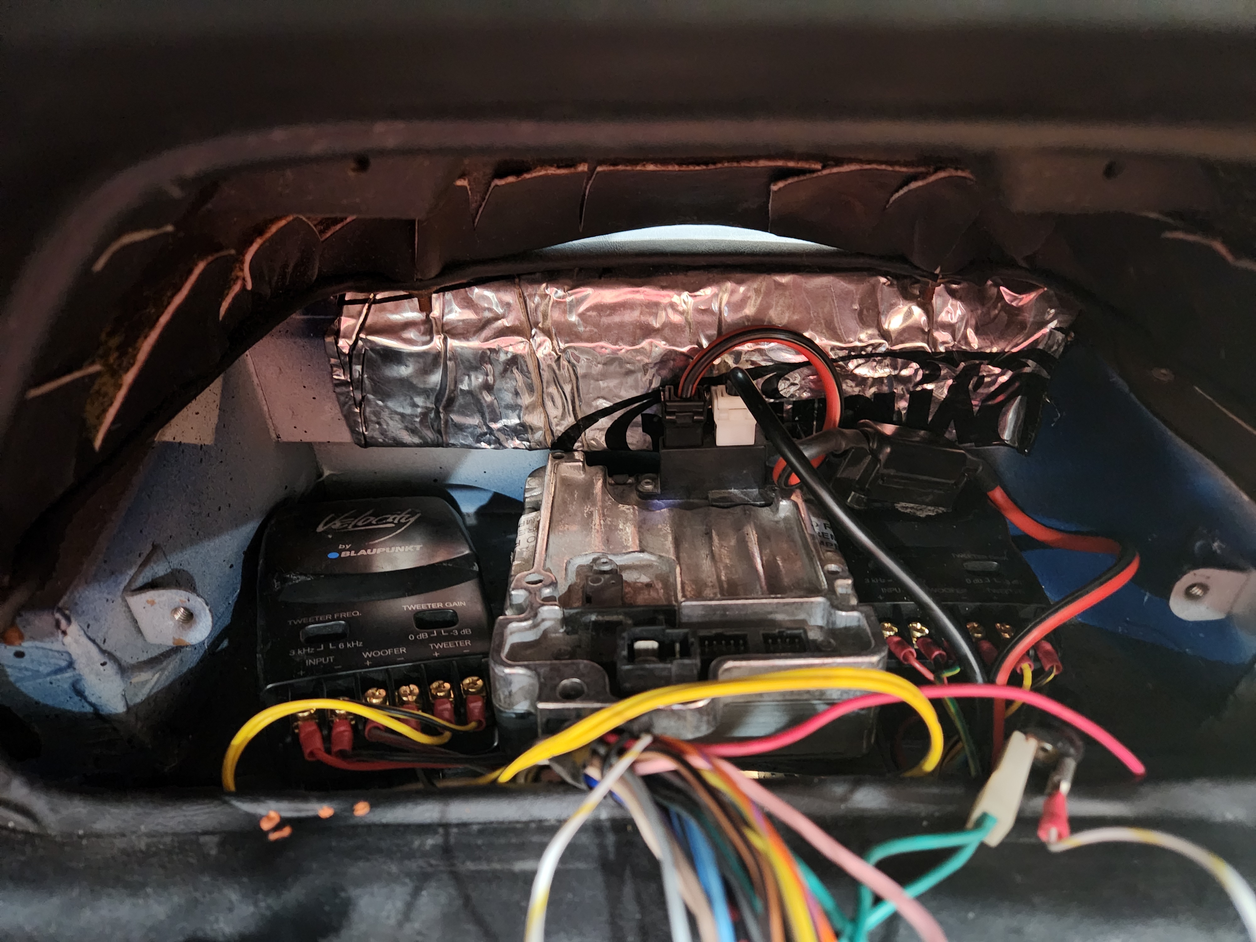 Then after looking a bit I decide I can probably get both the steering controller and speaker cross-over boxes up inside the dash behind the instrument panel....and I did get the screwdriver before just giving up for the day.