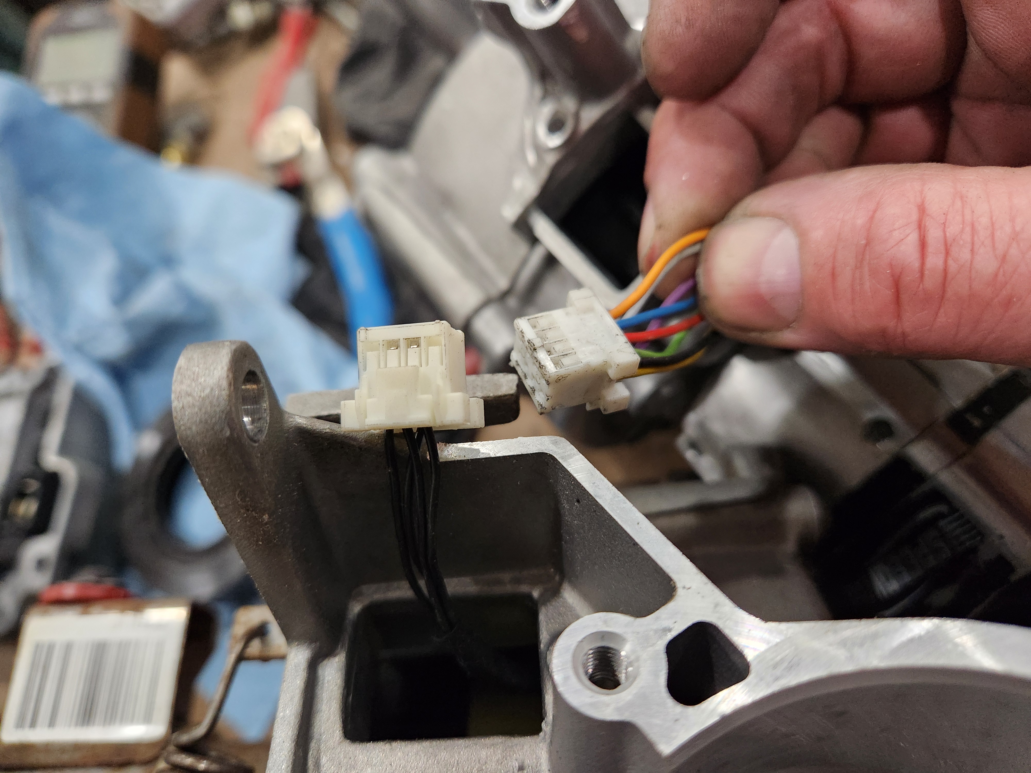 then on to looking at the steering unit. my plan was swap all the new guts into my modified housings.....but I took a short cut and welded the quicker to the PS unit so there is no way to disassemble that. ok, that is just a sensors, I can still swap the motor and that is probably the issue.....wait a minute.....my sensor unit is 8 wire and the new one 4 wire
