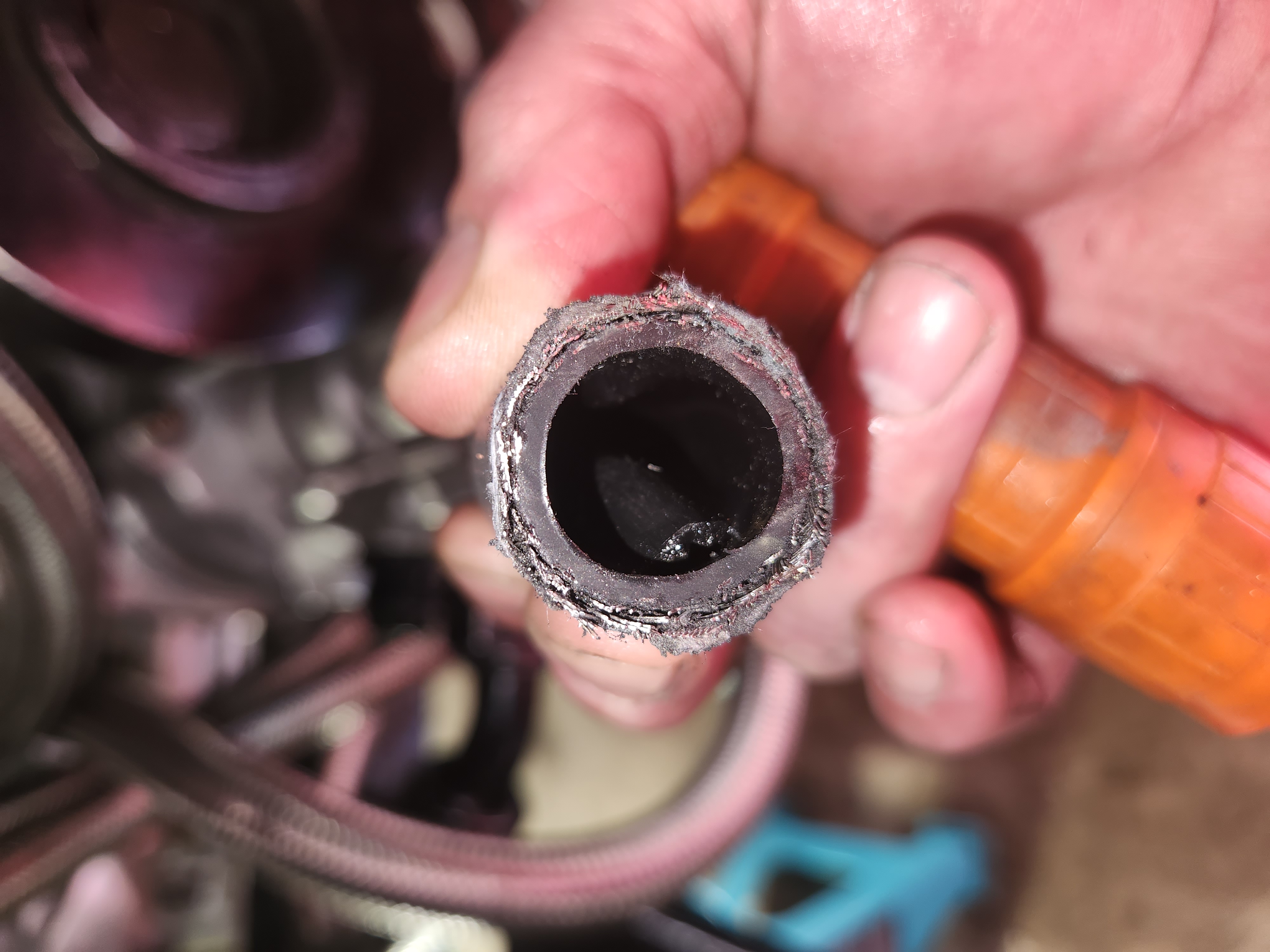 The new fitting came, I though about just popping the new fitting on, but decided to cut the hose back like ?I'm supposed and WTF? The ID is completely blocked