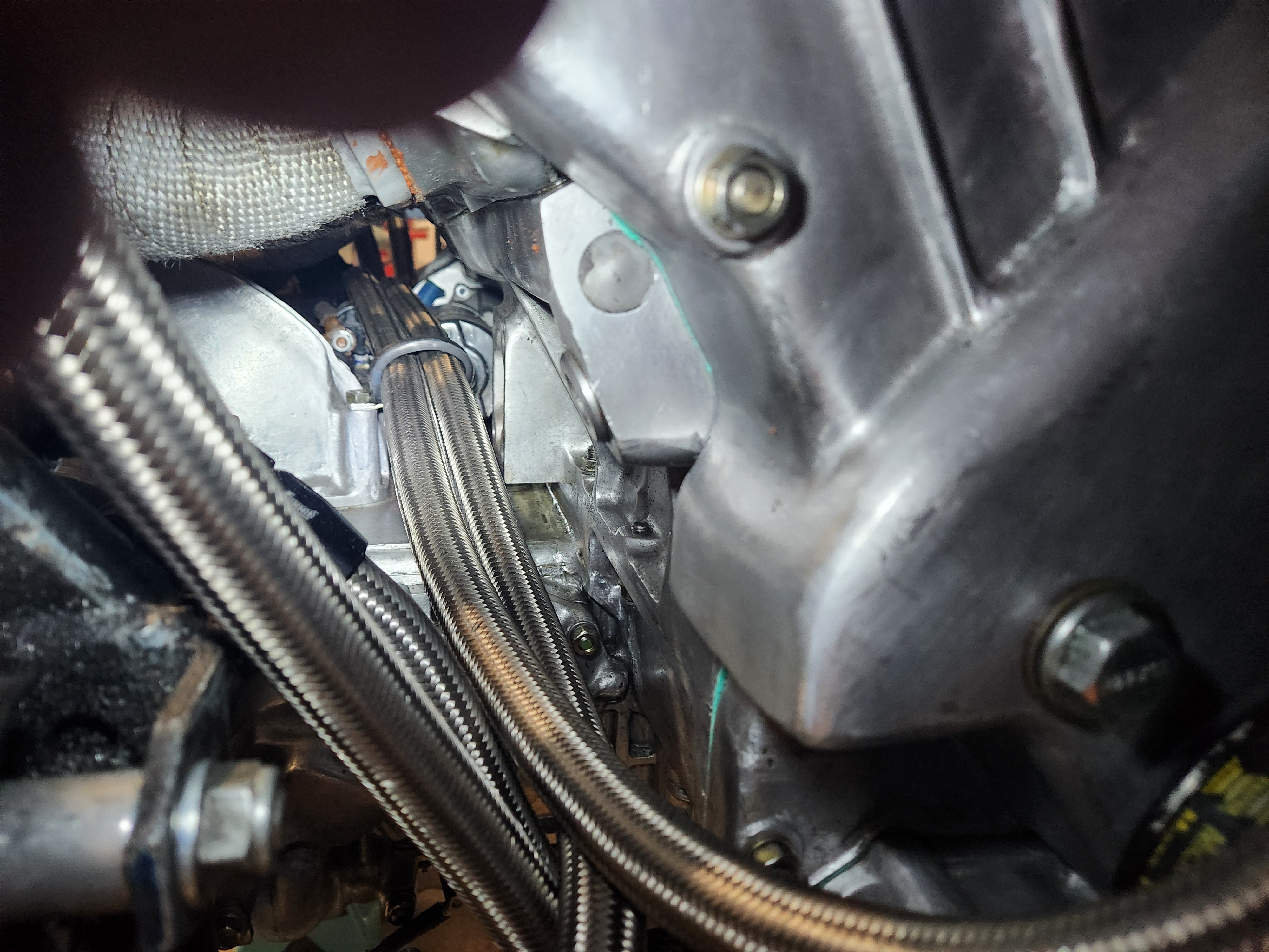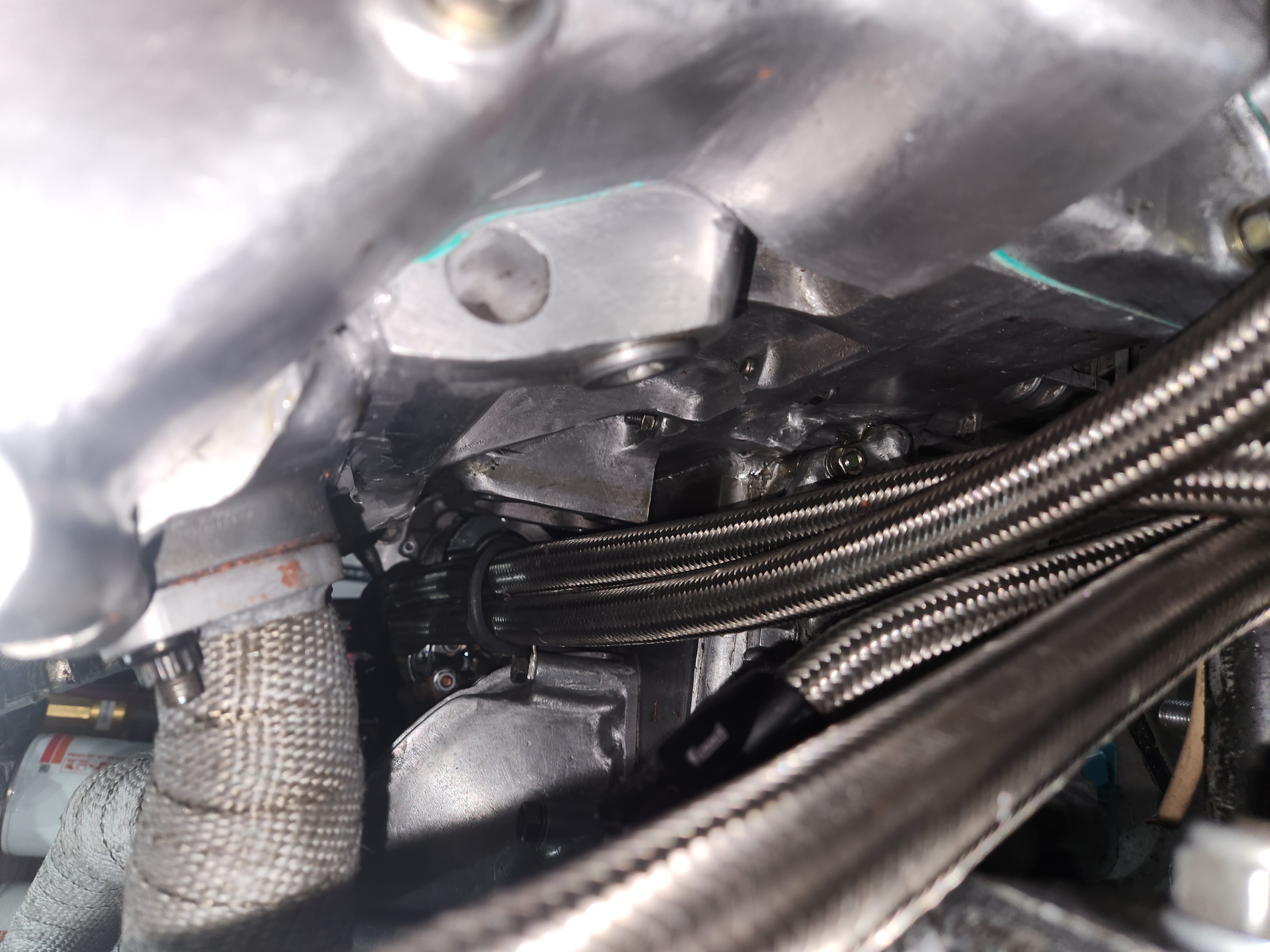 Its for sure the right hand side above that motor mount so at lunch today I cleaned off the goo and slathered it with the high temp orange and went back to work to let it dry. After work I decided to let it dry more and installed the repairs shock, found and fixed the idle timing issue ("Spark Timing" is the table, "Spark_Timing" is the output from the multiplexer that selects between the main table, idle table, and pedal blend calculation...the "_" matters), then played a bit more with the cranking fuel calcs and fuel timing and gave it a try. The timing was fixed but I also fixed it so it didn't start and the cranking drained the battery. After dinner and some time on the charger and a few more fuel tweaks it popped right to life better than ever. I let it get to about 70C and....its leaking. Its also still dropping a couple cylinders.