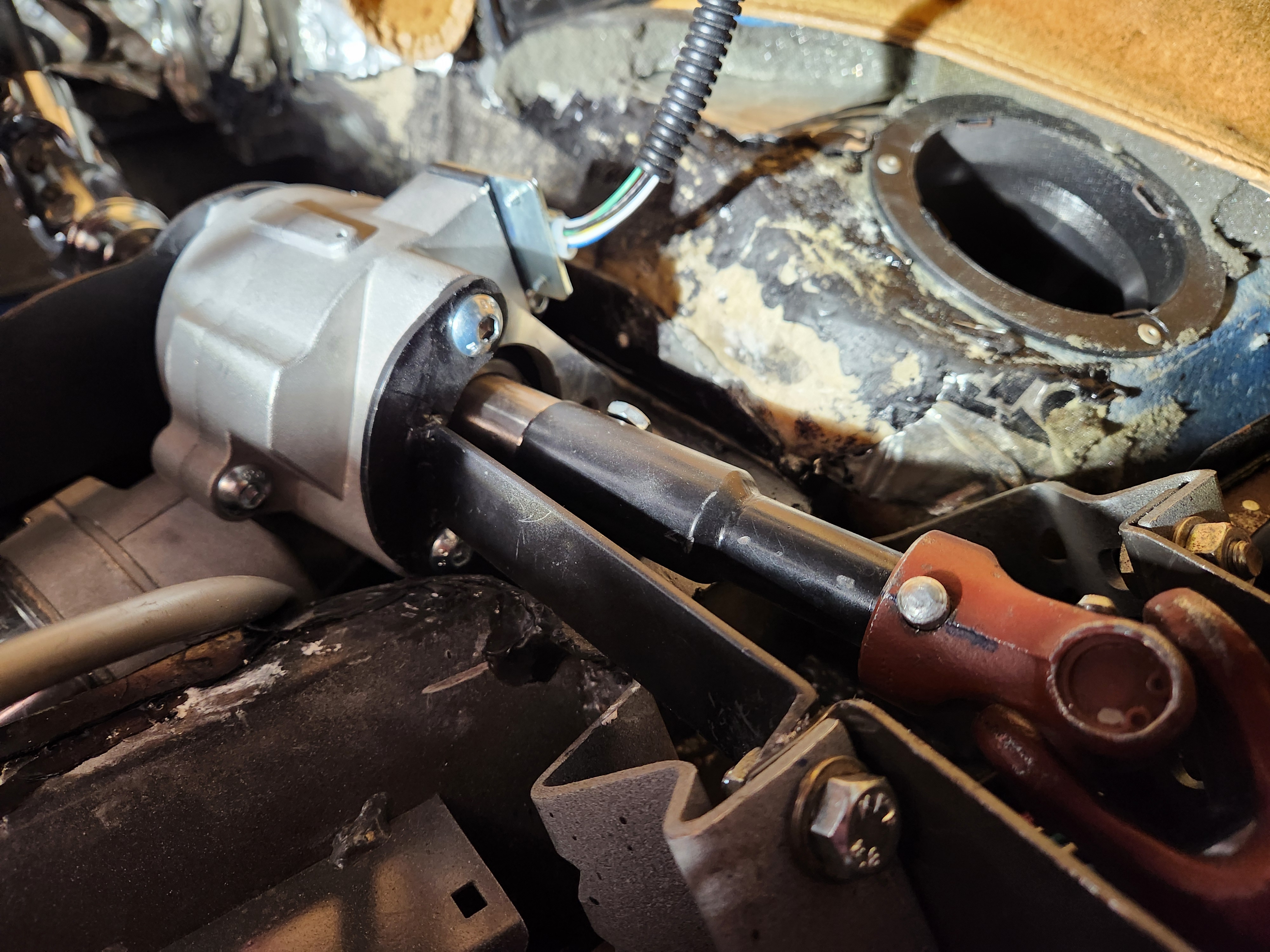 I didn't get as much time today as I hoped and things did go completely to plan. I did the final assembly and tightened everything down and notice a bit of play that clearly could not be written off as loose bolts. It turned out to be the a combination or the new double u-joint wanting a very rigid everything and the OEM column mounts having an "W" stamped into them to allow the collapsible column to work. After a bit of head scratching I decided on an additional bracket basically square to the 1st bracket. Kind of a bugger to install but its light weight and seems to have solved the issue. Yay.