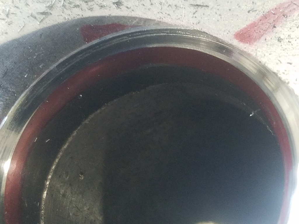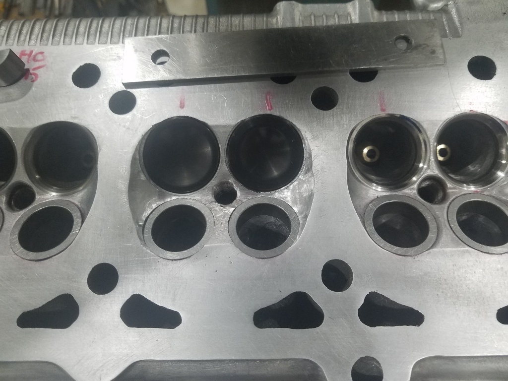 I decided to start on intake casue there were way less to cut, just the 2 from the smashed chamber and 3 more where I replace wonky looking guides and it was the wonky guides that seemed to cause the issue. ! head only needed 1 seat cut so thats where I started and had to cut about 30 off to clean it up because the best I can tell the wonky looking guided was just what it appeared and the center hole was angled. When I cut the seats I put a 5mm pin in the guide and indicate it true at about the seat position so a slight wrong angle somewhere can't result in a valve that doesn't sit on its seat. Then I replace the guide with a straight one which shifted the hole location a few thou and BAM, it can't be cleaned up without really sinking the valve and will need to be replaced. i't will be 2-3 weeks before I have another seat I'm guessing. In the pic, just above the red there is a more greyish area (from a quick lap) that is there towards the bottom and gone near the top right....that is where the valve is supposed to seat and clearly can't.