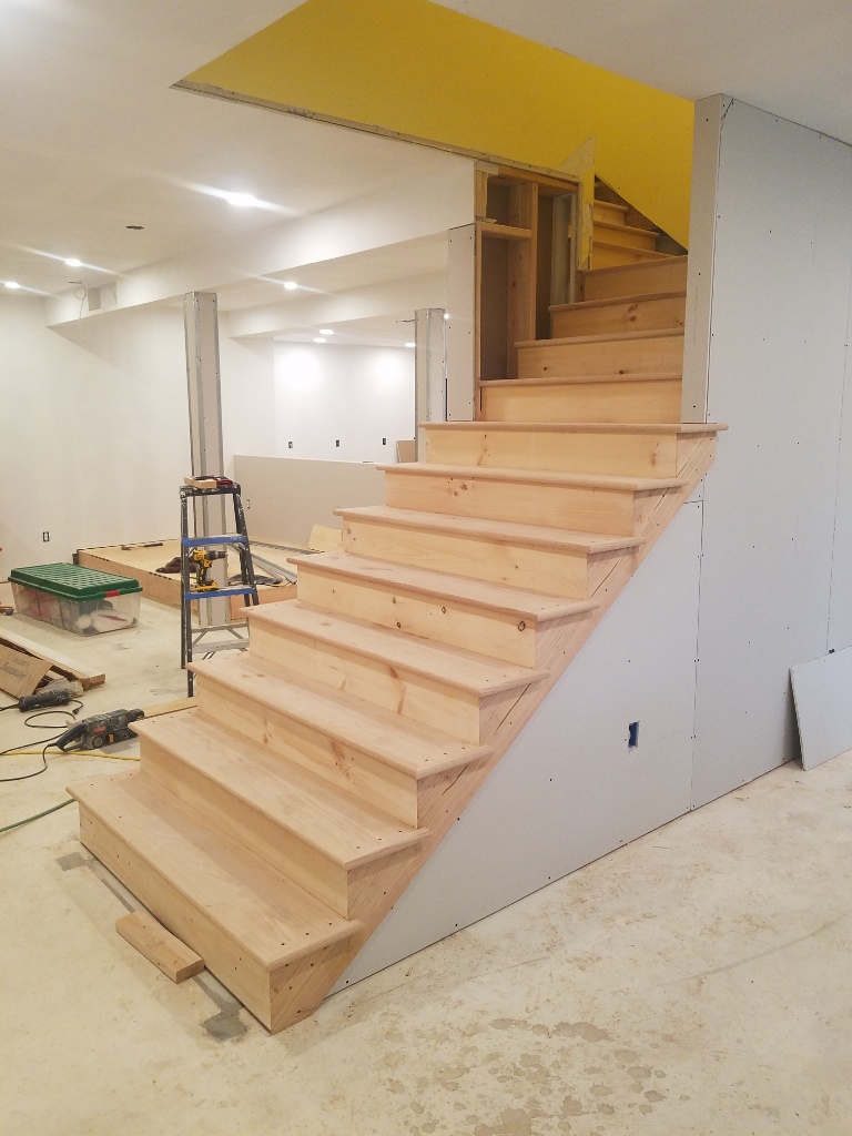 The risers and stringers are pine and will be white paint. I want to get the oak sealed now so I'm not worrying too much about about what spills on it know at worst a quick sand and topcoat and its perfect. Its also easier to not sand and paint around spindles. The painted stuff I'll leave and paint with the rest of the trim. This seems to have taken forever to get to this point but I'm hoping the pace picks up now.