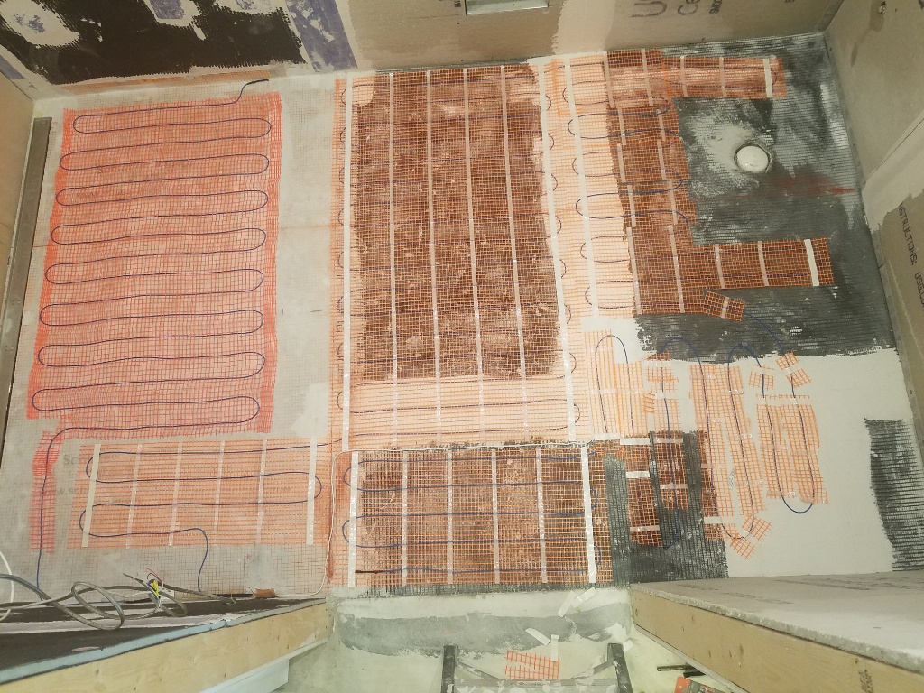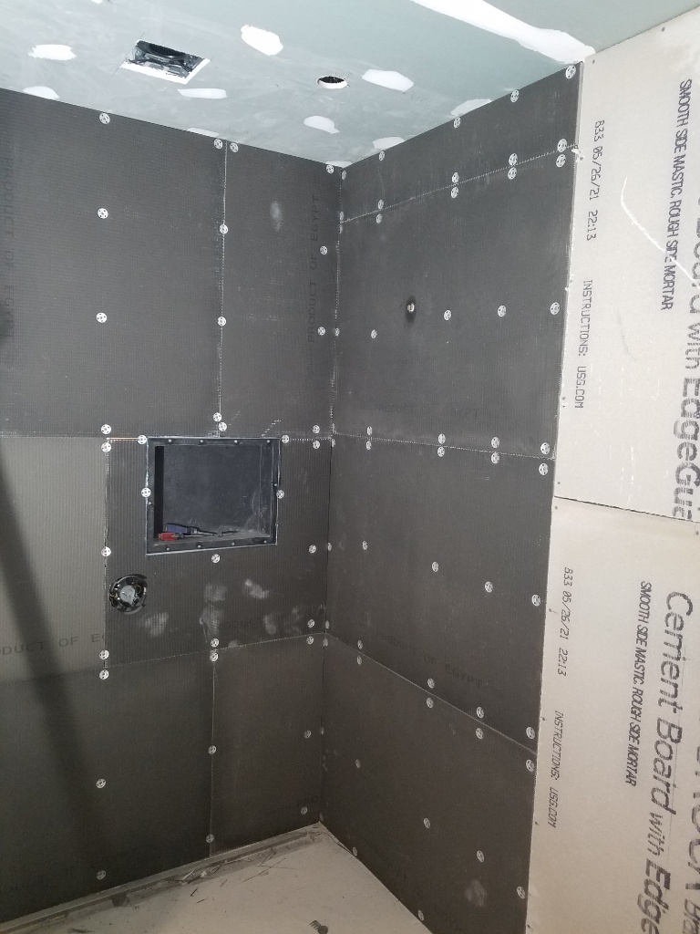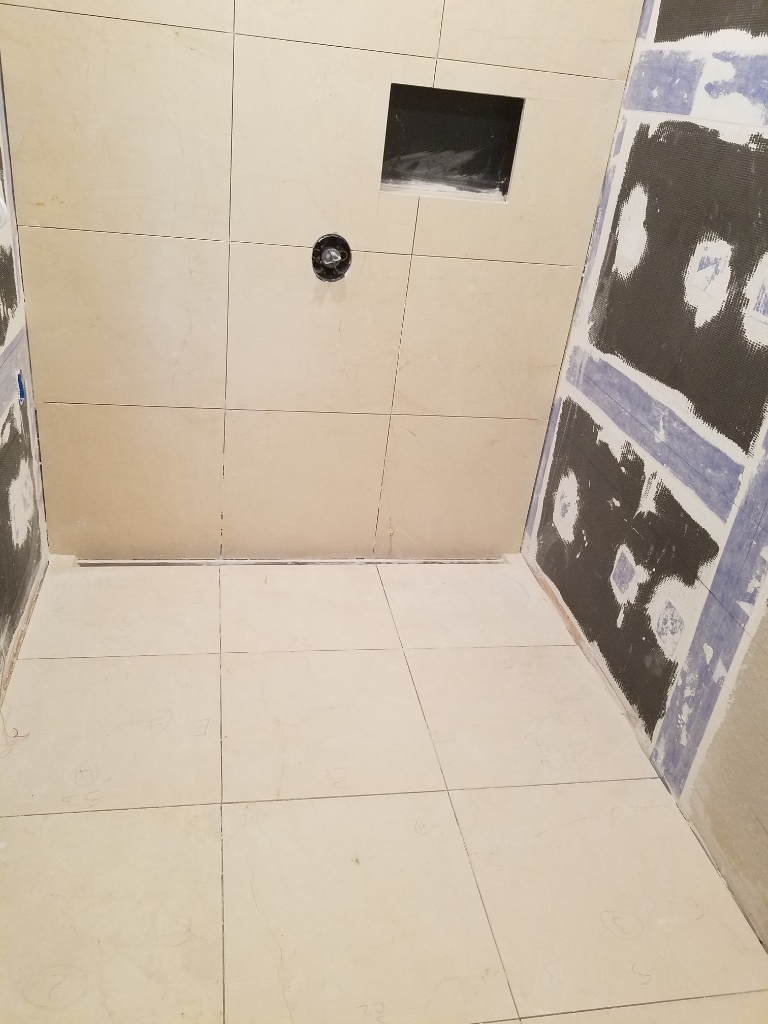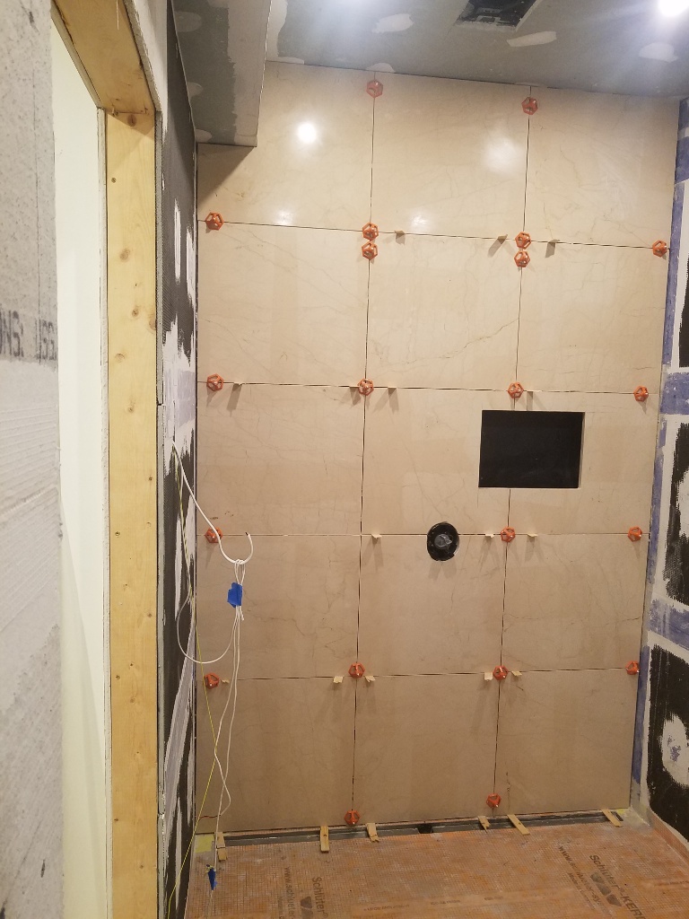 Just the one small tile over the door, the niche, and the drain has an insert that gets tiled so it kind of disappears into the floor....hopefully a couple hours and on to grout...once a color is chosen. So after about 3000lbs of stone, 600lb cements, maybe another 500lbs in backerboard my first thought was Ik glad its in the basement, the next thought was that I pity the fool who ever tries to remodel this.....then I thought maybe we should fit a steel door and call a panic room