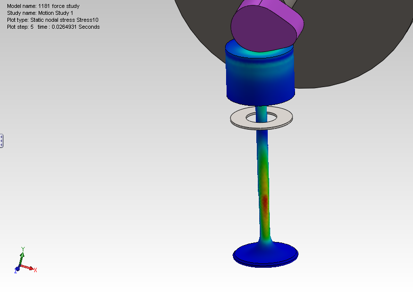 I've been able to run the 308 QV valve geometry and cam lobe thru this motion analysis, checking harmonics, deformation, etc.. It's a time consuming process though and requires that I run a liquid chilled processor! An interesting thing I noticed was that at near 8k rpm the tappet bucket exhibited a harmonic distortion on the bottom skirt, for me that answers why I've found some of them to have cracks in them like a bell. Over revving the engine runs the very real risk of a tappet bucket to harmonically crack at the bottom skirt.