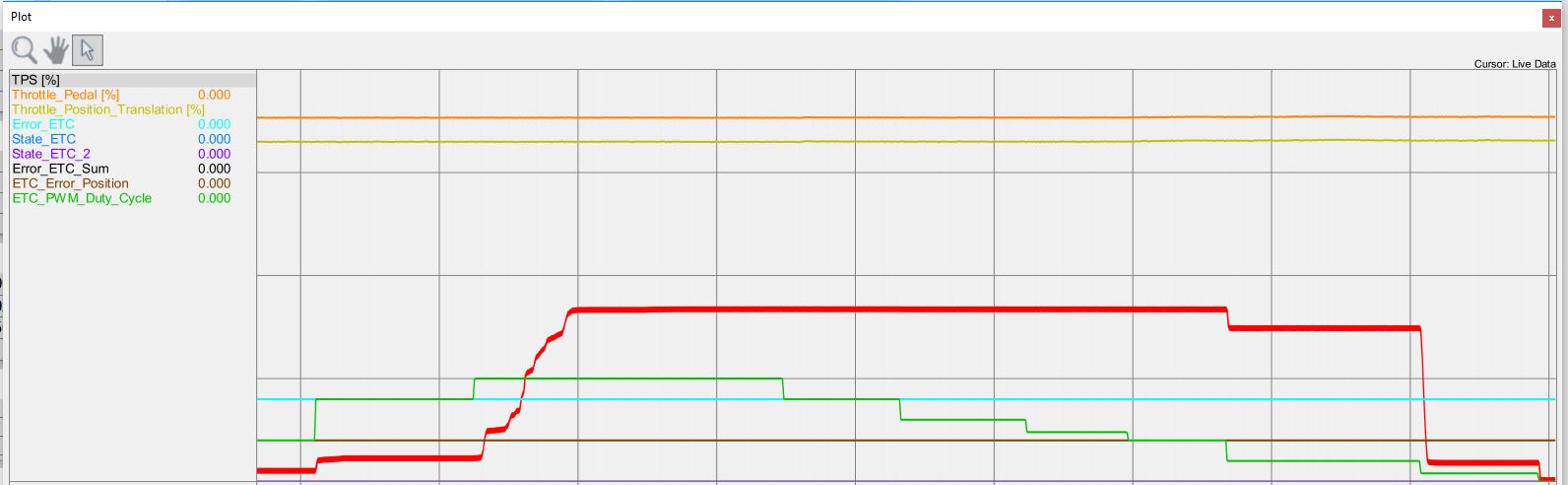 Below is picture proof I was out working on the car and a graph of output. Green is the ECU output, red is the throttle position....you can see they don't follow eachother. Lt blue is sitting at a value of 1 through it all meaning a position error has been detected and the system is in error mode.