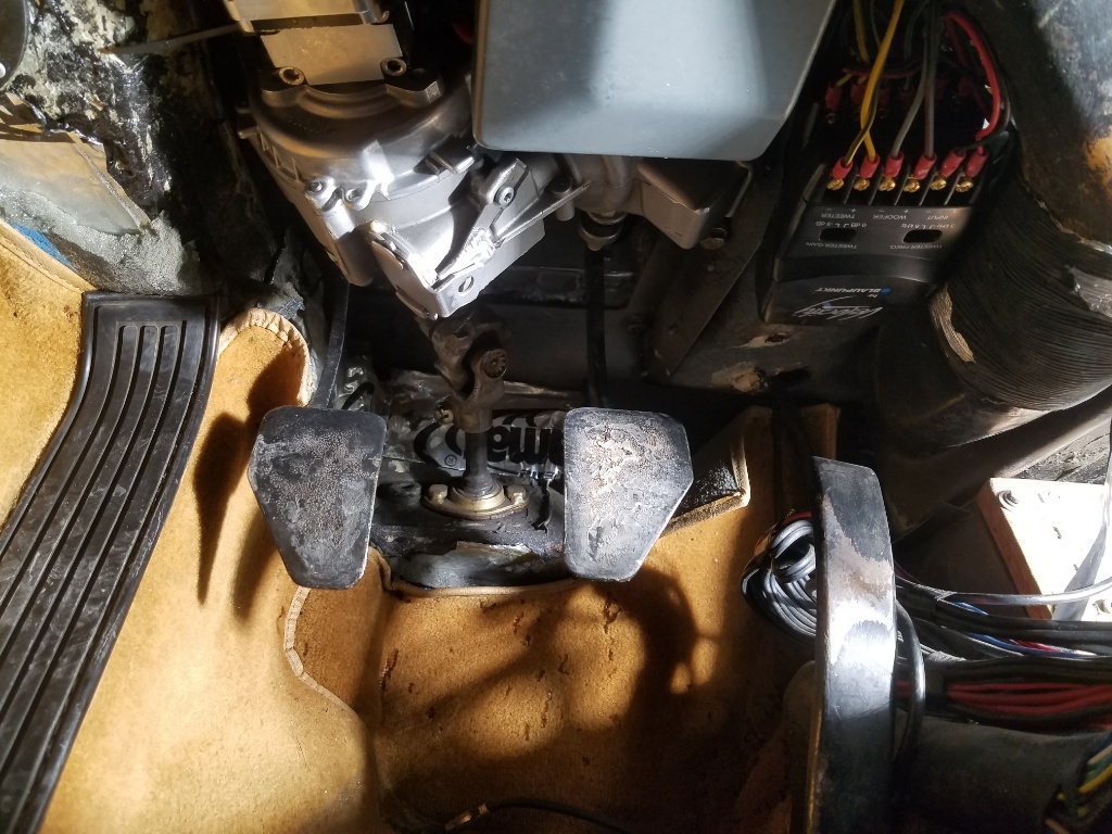 Last was the stupid clutch switch...the cute little M8 switch is not a standard M8 so it didn't fit. With the pedal box out I decided enough screwing around and retapped it to accept a a 308 brake pedal switch and a little weld on the pedal arm to give it a place to hit. Fixed. The little allen bolt you can see in the second pic is the pedal stop...a bit neater than the standard bolt or block on the floor.