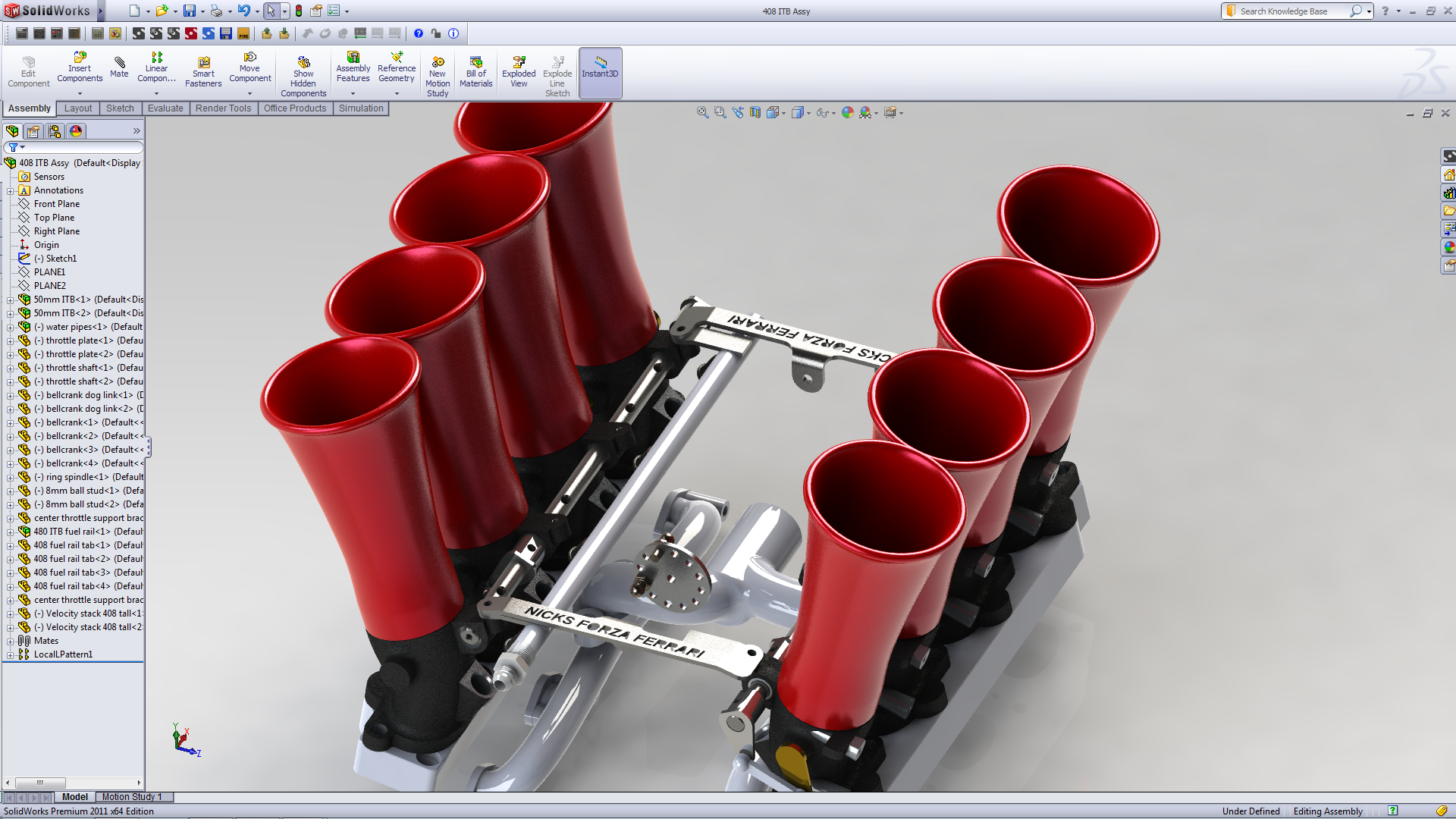 Tuned intake plenum would be fun but a real chore with separate banks, end up looking like the F360 or any of the modern ones with shared plenum valving. For this one Nick wants some flash and ITB's with tuned velocity stacks scratch that itch for him. These ITB's are from the BMW M6 V10, fancy units that are perfect for these projects. cast stainless bellcranks, nichrome springs, needle roller sealed bearings for the shafts, etc.. 50mm bore with a 25* sweep transition to an oval that's just about the perfect size.