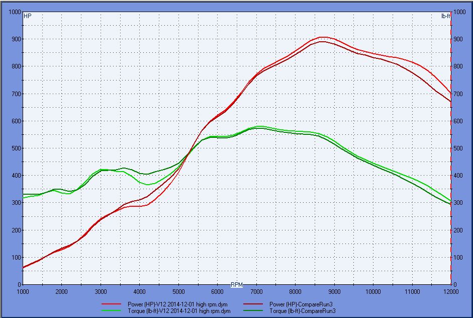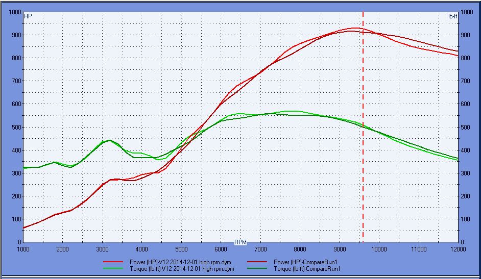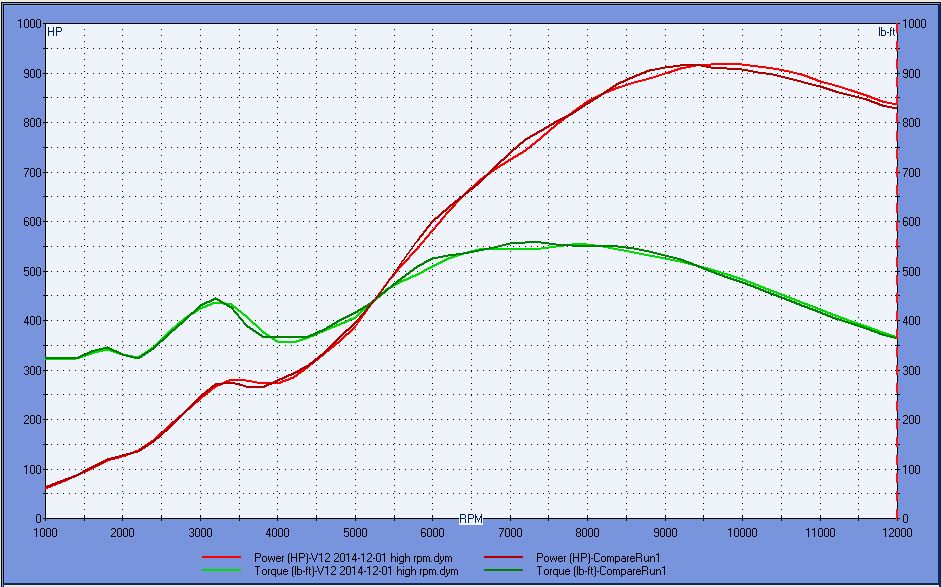 I was playing with a 3.4L 308QV build file today and noticed something about build stack length that seems to apply to the V12 as well. 9500 is about as high as I'm willing to spin it and Pipe max (simulator/predictor tool) says about a 13" intake is ideal and Dynomation (my normal simulator) likes that well enough..... but doesn't think its optimal on this engine (or the other engine that got me looking at it). A 15" intake makes the most hp at 9500 with 931 vs 916 and it what I use in most of my simulations. (light green/red are 15", dark are 13")