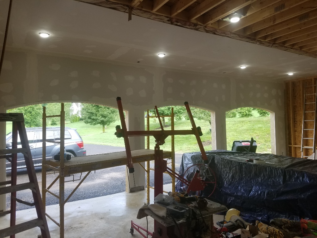 Rain outside meant drywall indide. Finished the second row on the ceiling and most of the front wall. I think I'd like to tape,mud, paint or at least prime before the doors go on....but timing depends on the weather as the patio is waiting.