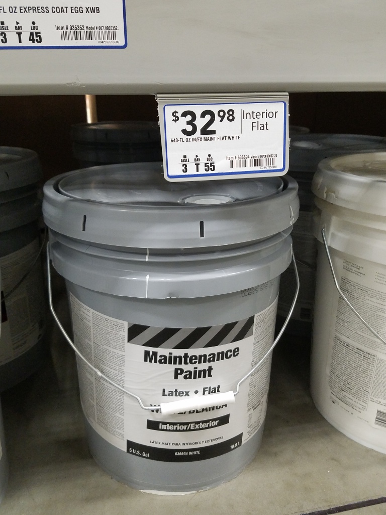 It's raining so time for paint. Notice the difference between what you find at the front of the paint aisle and hidden in the very back....just $33 for a 5 gal bucket! Score!