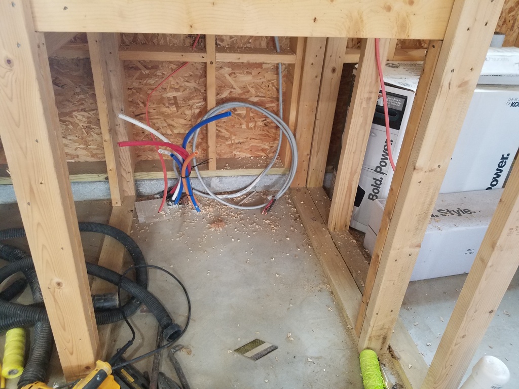 Last night I finished up the wire for the water heater...decided to mount the waterheater under the bathroom sink thinking its easier/cheaper to be sure the bathroom is warn and nothing freezes. The floor heat will have antifreeze so no worries there.