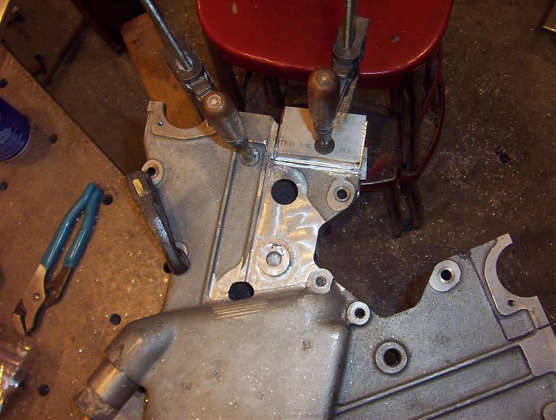 12-23-2007 The plan is actually quite simple, cut out what’s there now with the holes all in the wrong places and weld in new metal so I can put the holes where I want them. This is the easy part really and most of the work I’m going to be doing over the next few days will be more cosmetic than anything else. I want to get it looking like the parts were all made to be together and not an afterthought…..and that will mean changing the shape of the top part of the timing cover, shortening the 2 top covers to match and attaching them to the cam covers. None of it’s very hard, it just takes a bit of time.
