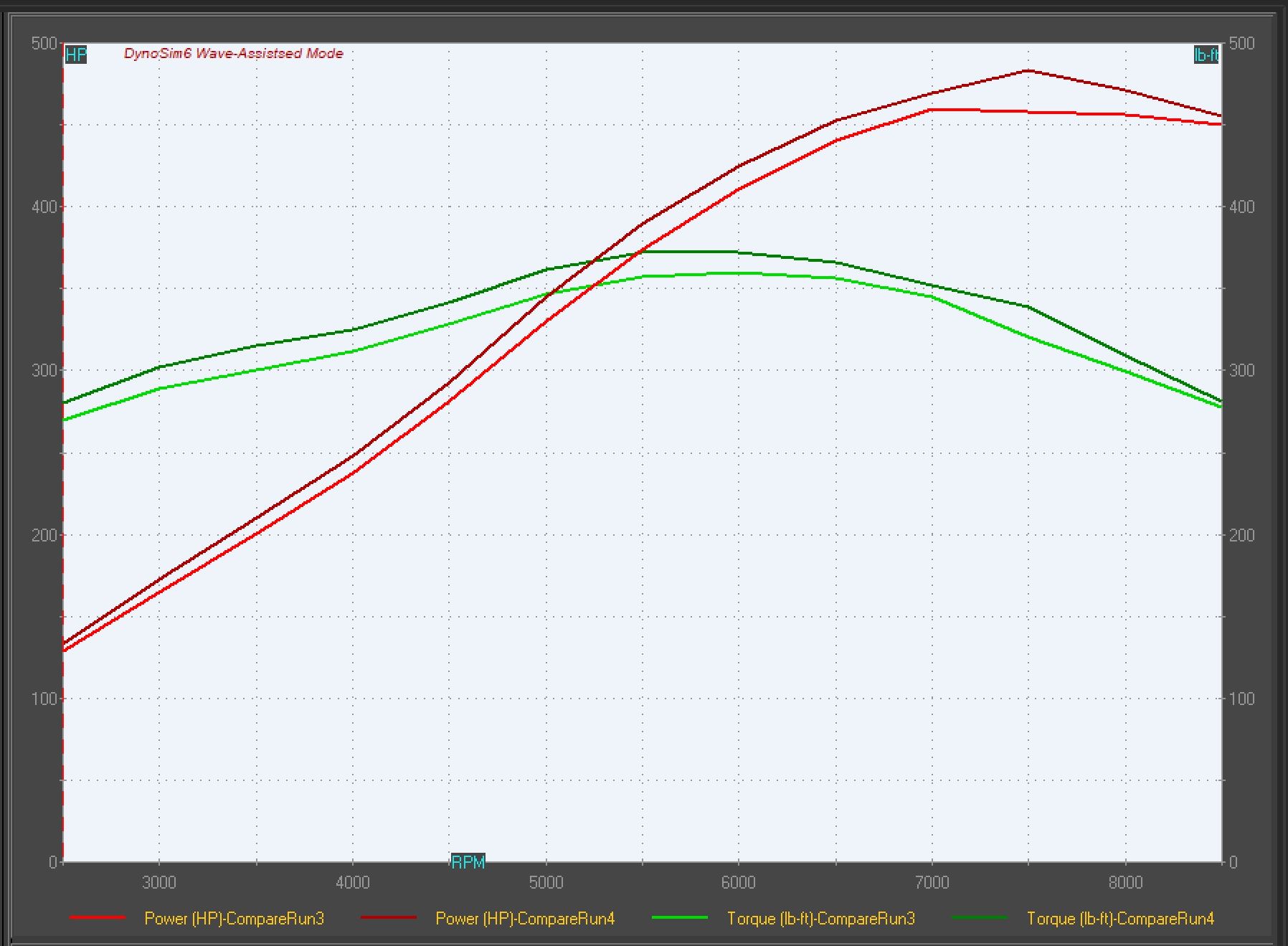 Now here is the double intake cam as the new base compared to my cams (275/287 @.006). I tried my intake as the exhaust but my exhaust does a little better, hastes my exhaust in the intake