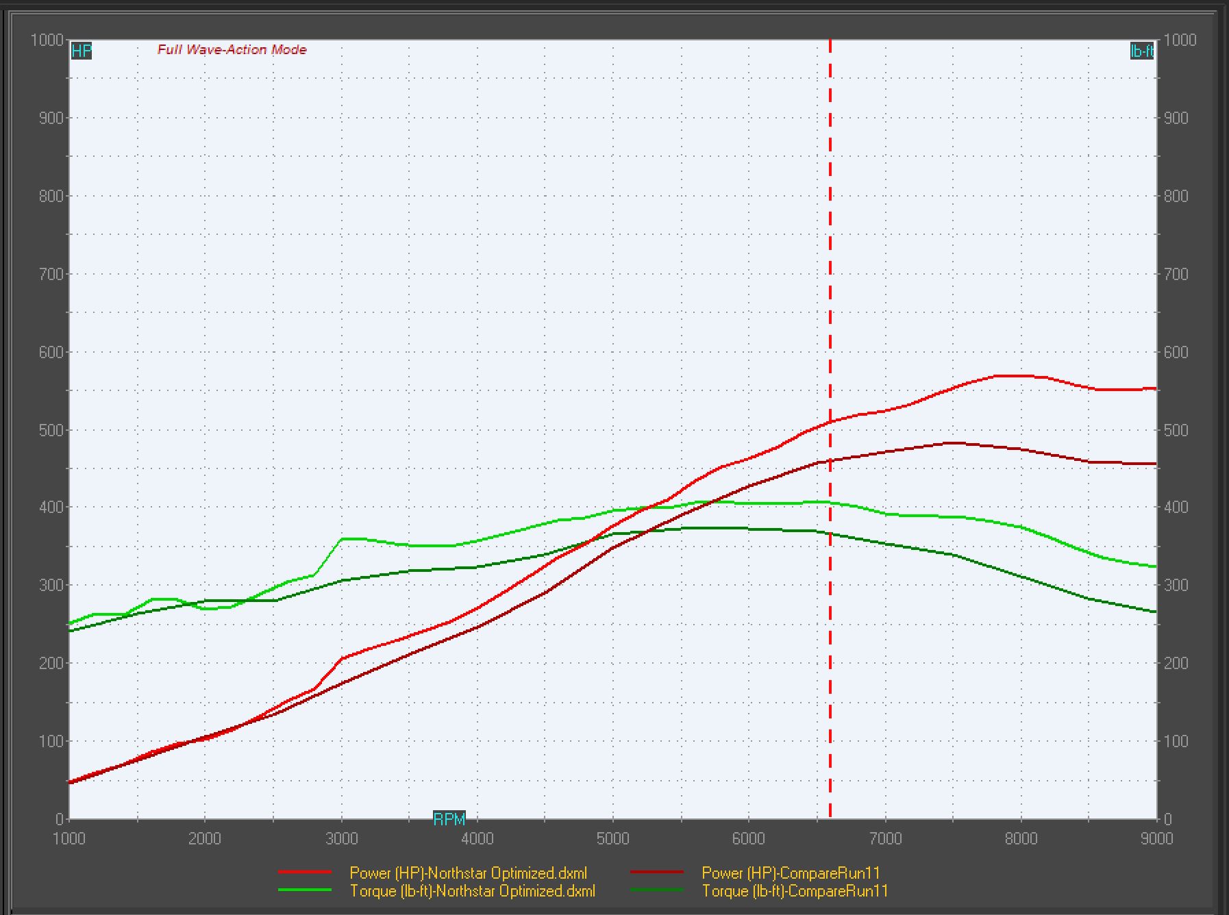 You have basically the same valve sizes as me so if I give you me head, my cams and play with the intake and header lengths...569hp @8000rpm, the 266/266 setup on the same graph to compare. So now you kind of have the range and every else will fall inbetween the baseline setup (266/244 OEM intake) and this one.