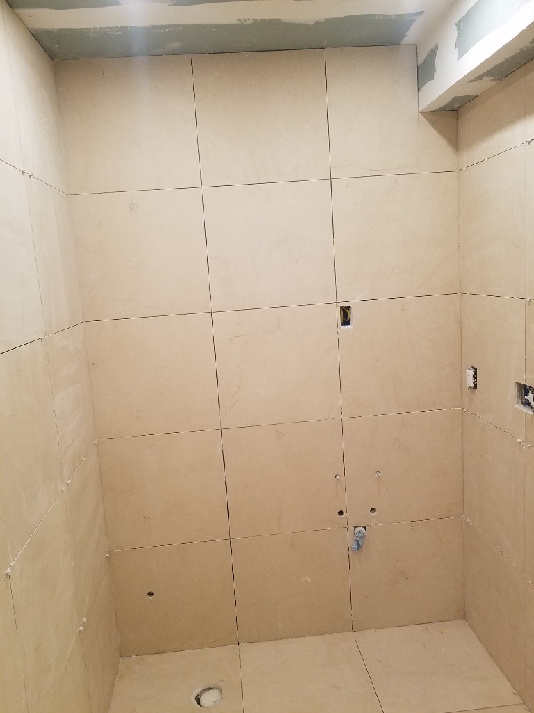 Just the one small tile over the door, the niche, and the drain has an insert that gets tiled so it kind of disappears into the floor....hopefully a couple hours and on to grout...once a color is chosen. So after about 3000lbs of stone, 600lb cements, maybe another 500lbs in backerboard my first thought was Ik glad its in the basement, the next thought was that I pity the fool who ever tries to remodel this.....then I thought maybe we should fit a steel door and call a panic room