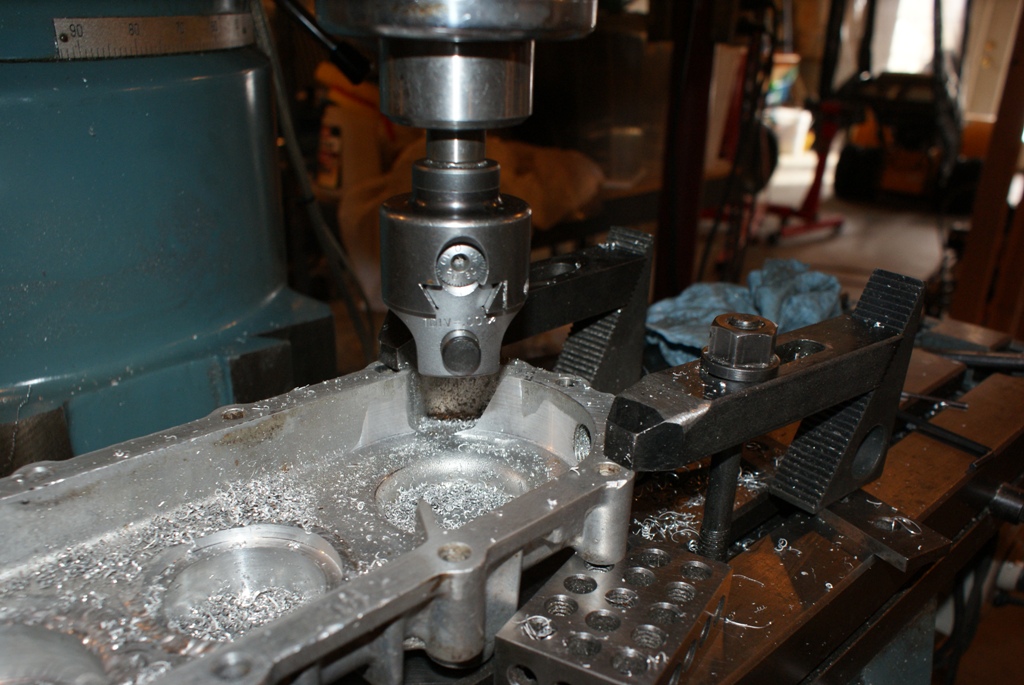 Then I got started on the cover machining. . i did so general clean-up then set everything back up in the mill to locate the bearing. I decided that the best way to know for sure that the outer bearing line up with the inner bearing was to indicate the inner then put the cover on and pop a hole in it at the location. Next I'll flip the cover over the indicate in the hole and have the exact right spot. When I'm all done I'll close the holes using thread in plugs or more likely just weld them shut.